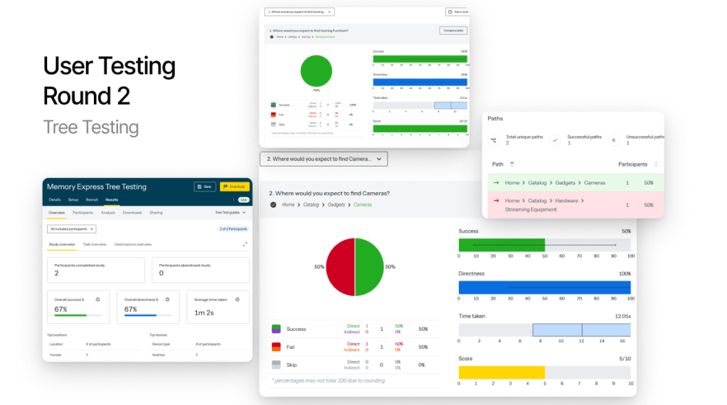 Our redesigned site map underwent many revisions, informed by card sorting and tree testing exercises, along with a comparative analysis and in-class critiques. By understanding how users navigate complex systems, we developed an optimized sitemap for Memory Express, prioritizing product categories and user flows for easier access to popular items.