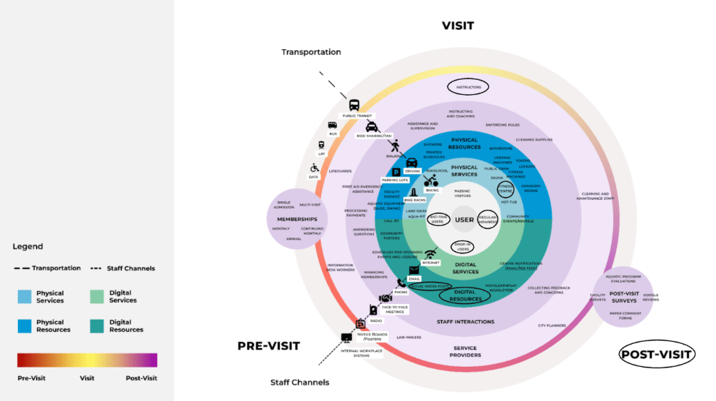 RESEARCH: My team visited the Londonderry leisure centre to speak with local residents and get a sense of the community. We charted key elements of the user experience journey with an ecosystem map, looking at all the elements that make up the services offered by the city’s leisure centres. This includes physical and digital resources, touchpoints, and all the actors that play a part in delivering services.