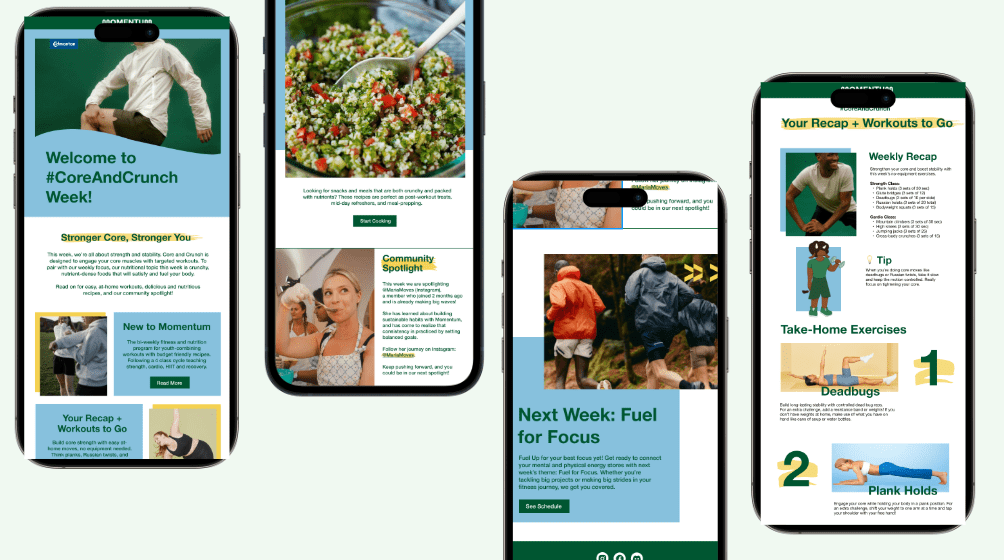 SOLUTION: Our solution was Momentum — a novel group fitness and wellness program that runs twice a week at the Londonderry centre. Each week would feature 2 of the 4 class types. Every class is beginner-friendly and community-oriented.